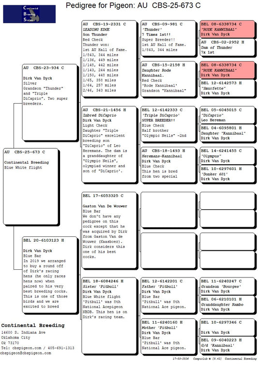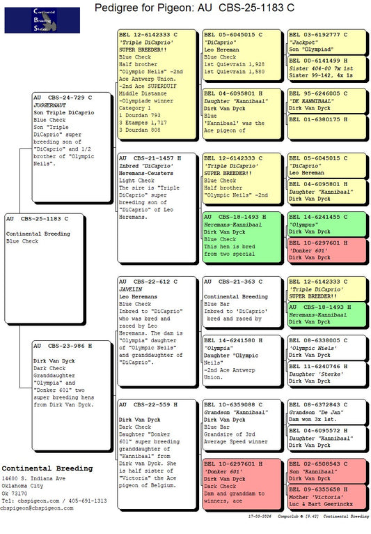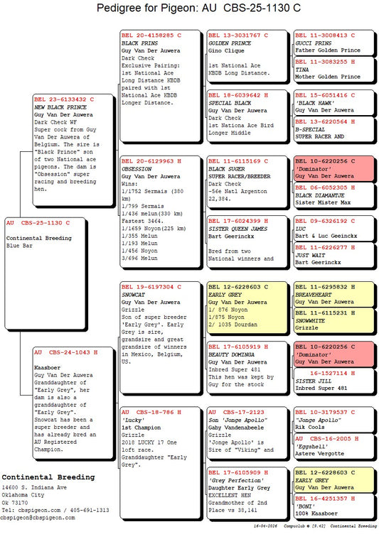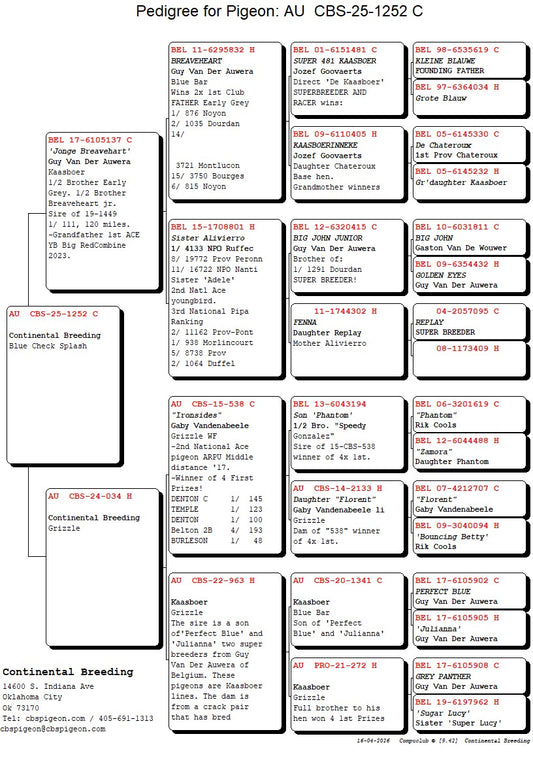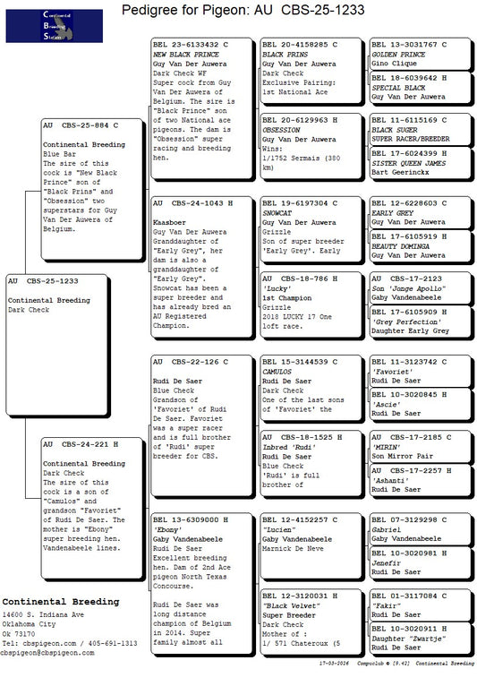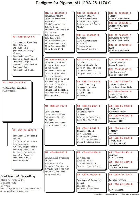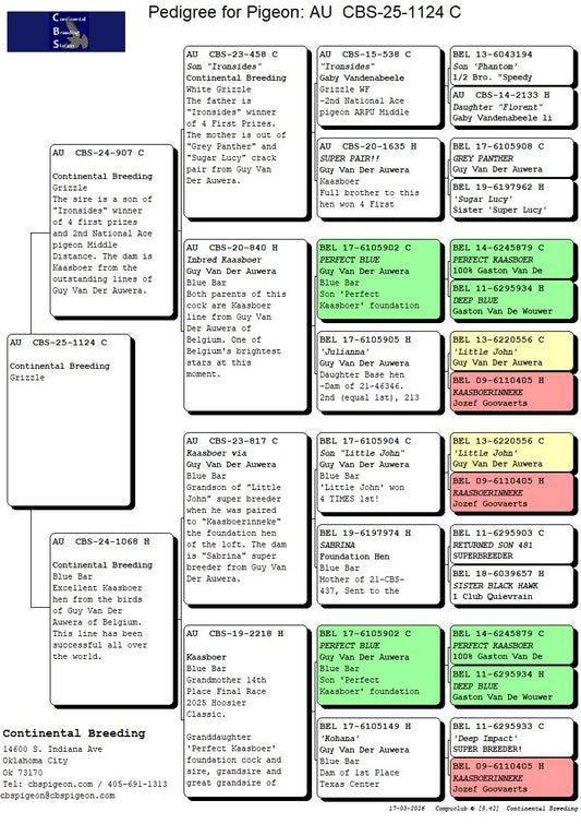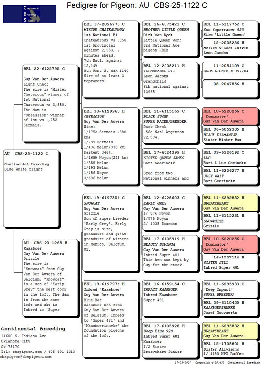 25-CBS-1122 Blue white flight cock. Grandson "Mr. Chateroux" and "Obsession" of Guy Van Der Auwera. Top Kaasboer LInes.