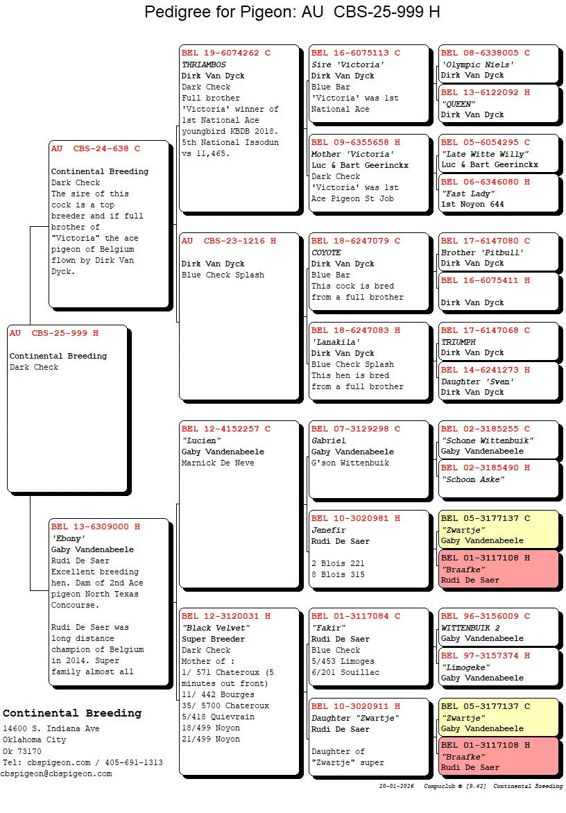 25-CBS-999 Dark Check hen. Daughter "Ebony". Granddaughter "Thriambos"